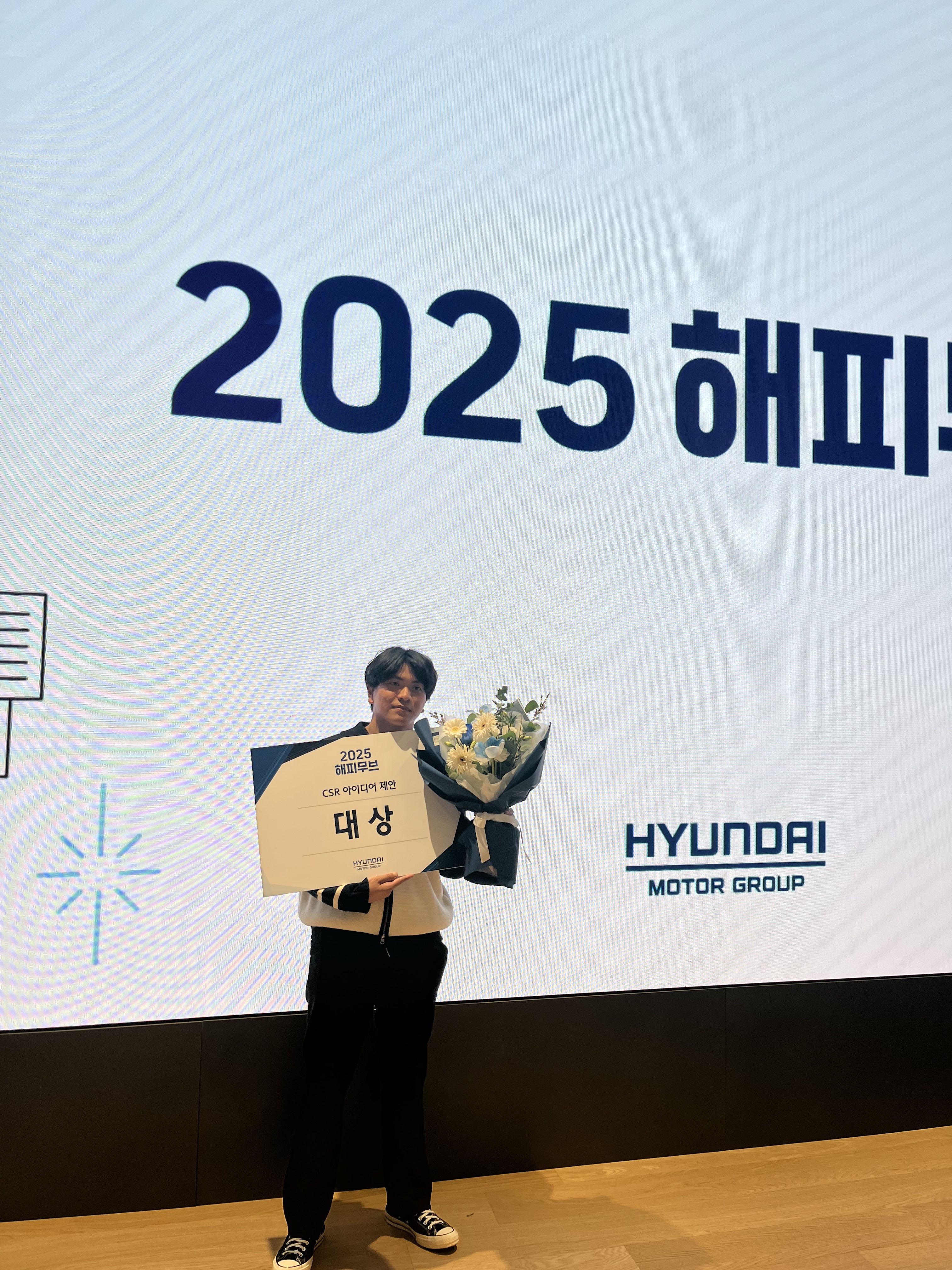 우리 과 2학년 재학 중인 ‘원정운 학생’이 지난 9월 26일 개최된 현대자동차그룹 주관 대학생 사회공헌 프로그램 ‘해피무브’ 발표회에서 대상을 수상하였습니다.