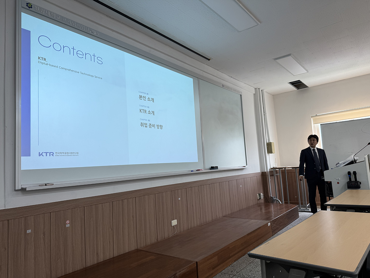2025년 9월 30일, LITE산학옴니버스 교과목 시간에 현 (재)한국화학융합시험연구원의 책임연구원으로 재직하고 있으며 학과 선배인 양승현 박사님의 특강을 진행하였습니다.